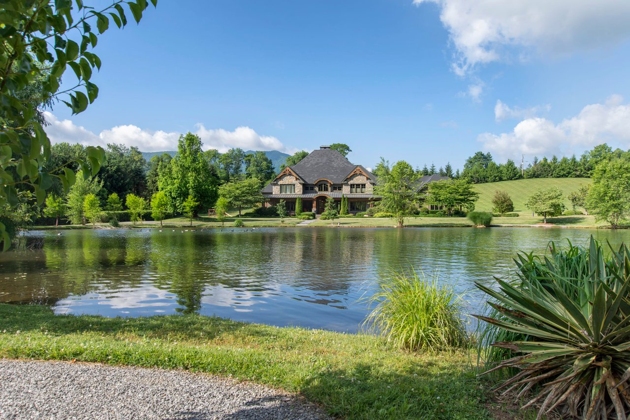 Extraordinary private and gated estate in the gorgeous countryside of Waynesville, only minutes to the charming downtown area. This impressive home sits on 11 level acres with large trout pond and native rushing trout stream. Catch rainbow trout and prepare them in your inviting outdoor kitchen & dining area. Enjoy summer days outside at the pool surrounded by amazing mountain views and exquisite gardens. Enter this magnificent home through the grand foyer with beautiful hardwood floors leading you to the great room with a two-story wall of windows and stone fireplace. You will appreciate the thoughtful attention to flow in the design of this home, fantastic for entertaining! The kitchen, master bedroom and living room all open the the rear terraces and pool. The second floor offers spacious guest suites a theater, entertainment room and an intimate bar and lounge to gather at the end of a fun day together! PLUS - Barn/Workshop, Huge Pavilion, Organic Gardens & So Much More!